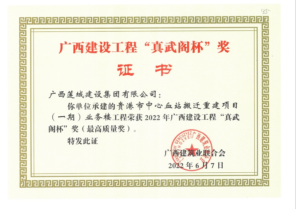 2022年廣西建設(shè)工程“真武閣杯”獎(jiǎng)(最高質(zhì)量獎(jiǎng))貴港市中心血站搬遷重建項(xiàng)目(一期)業(yè)務(wù)樓工程,項(xiàng)目經(jīng)理:覃如貴