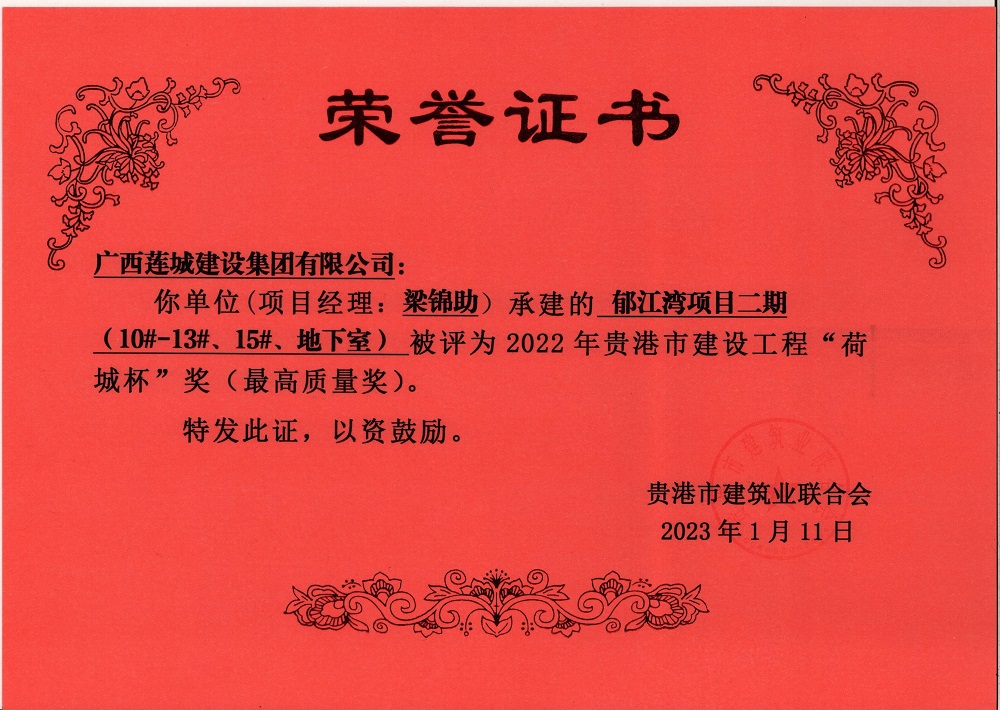 2022年貴港市建設(shè)工程“荷城杯”獎(jiǎng)(最高質(zhì)量獎(jiǎng))郁江灣項(xiàng)目二期(10#-13#.15#、地下室,項(xiàng)目經(jīng)理:梁錦助)