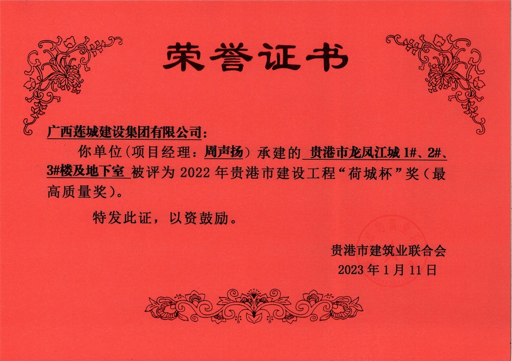 2022年貴港市建設(shè)工程“荷城杯”獎(jiǎng)(最高質(zhì)量獎(jiǎng))貴港市龍鳳江城1#、2#、3#樓及地下室,項(xiàng)目經(jīng)理:周聲揚(yáng)