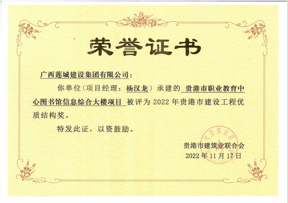 2022年貴港市建設(shè)工程優(yōu)質(zhì)結(jié)構(gòu)獎(jiǎng)貴港市職業(yè)教育中心圖書館信息綜合大樓項(xiàng)目,項(xiàng)目經(jīng)理:楊漢龍