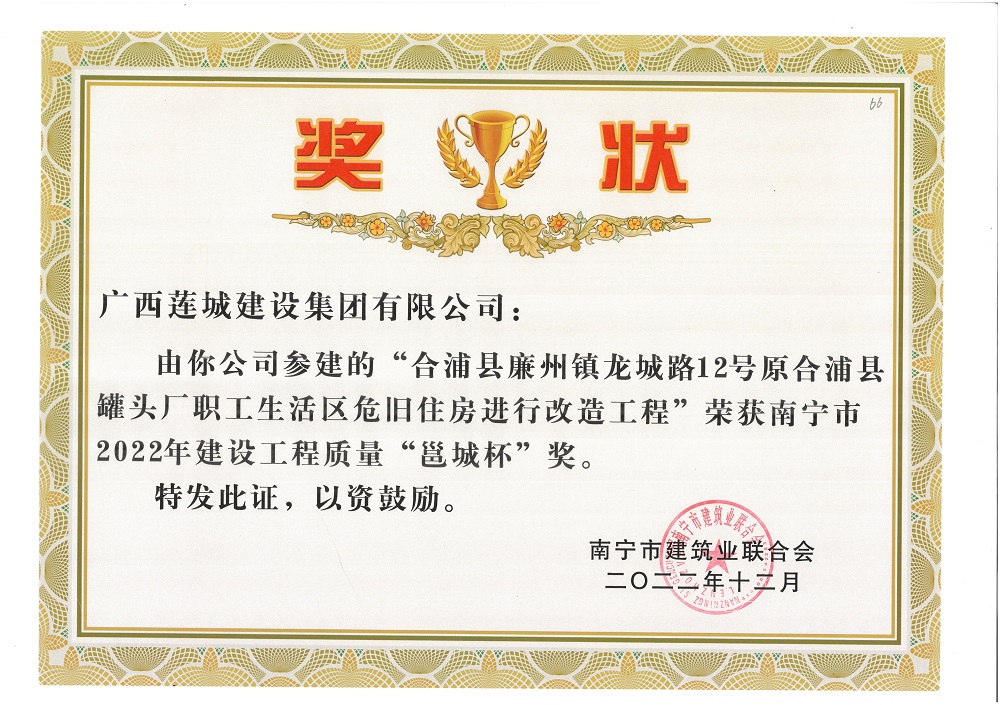 2022年建設(shè)工程質(zhì)量“邕城杯”獎(jiǎng)合浦縣廉州鎮(zhèn)龍城路12號(hào)原合浦縣罐頭廠職工生活區(qū)危舊住房進(jìn)行改造工程