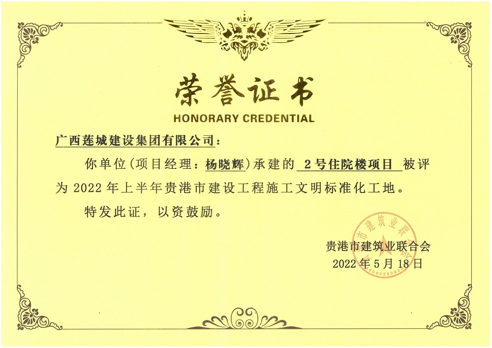 2022年上半年貴港市建設(shè)工程施工文明標(biāo)準(zhǔn)化工地2號(hào)住院樓項(xiàng)目,項(xiàng)目經(jīng)理:楊曉輝