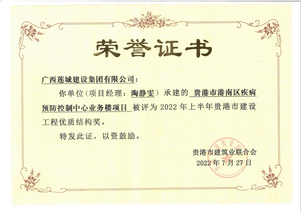 2022年上半年貴港市建設(shè)工程優(yōu)質(zhì)結(jié)構(gòu)獎(jiǎng)貴港市港南區(qū)疾病預(yù)防控制中心業(yè)務(wù)樓項(xiàng)目,項(xiàng)目經(jīng)理:陶靜雯