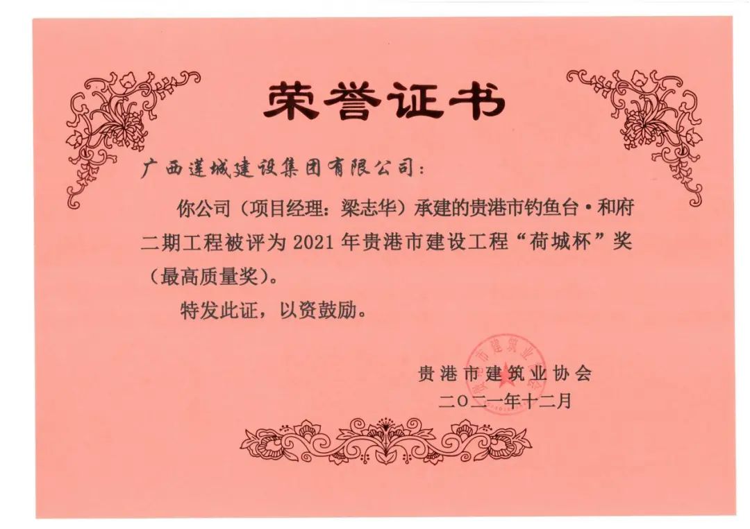 經(jīng)貴港市建筑業(yè)協(xié)會評選公示,集團(tuán)公司承建的貴港市釣魚臺·和府二期工程,貴港市港北區(qū)高級中學(xué)教學(xué)樓工程,貴港市港南區(qū)江南消防站項目工程,貴港市檢察院辦案和專業(yè)技術(shù)用房、地下訓(xùn)練場工程,貴港市中心血站搬遷重建項目(一期)業(yè)務(wù)樓工程等5個項目被評為2021年貴港市建設(shè)工程“荷城杯”獎(最高質(zhì)量獎)。
