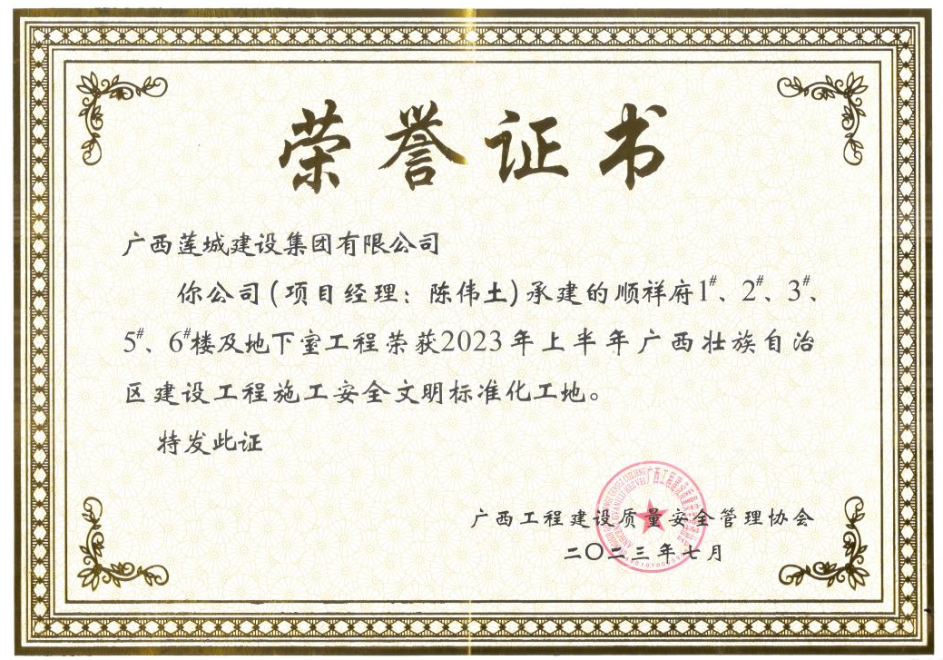 同時,由集團公司承建的順祥府1#、2#、3#、5#、6#樓及地下室工程榮獲2023年上半年廣西壯族自治區(qū)建設(shè)工程施工安全文明標準化工地獎;桂平市易地扶貧搬遷長安工業(yè)集中區(qū)標準廠房項目榮獲2023年貴港市建設(shè)工程優(yōu)質(zhì)結(jié)構(gòu)獎。