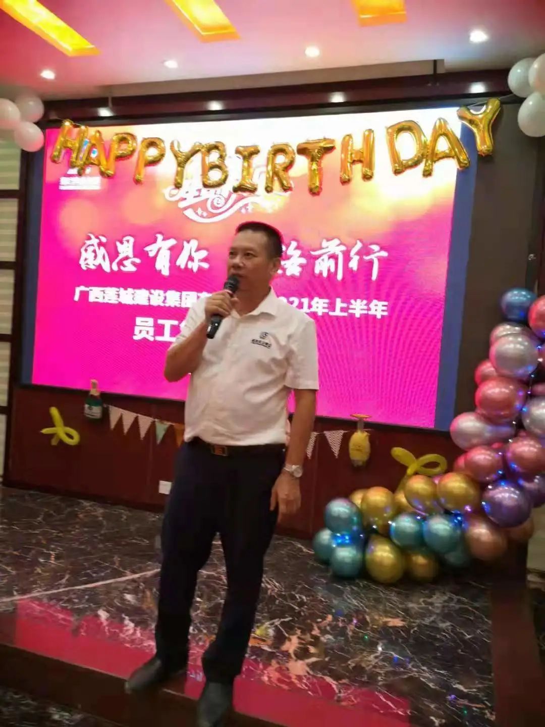 7月2日晚,廣西蓮城建設(shè)集團(tuán)有限公司在貴港市新誼賓酒店二樓舉辦以“感恩有你 一路前行”為主題的2021年上半年員工集體生日會(huì),集團(tuán)公司貴港辦公區(qū)全體員工歡聚一堂為2021年上半年生日的15位壽星們共慶生日。