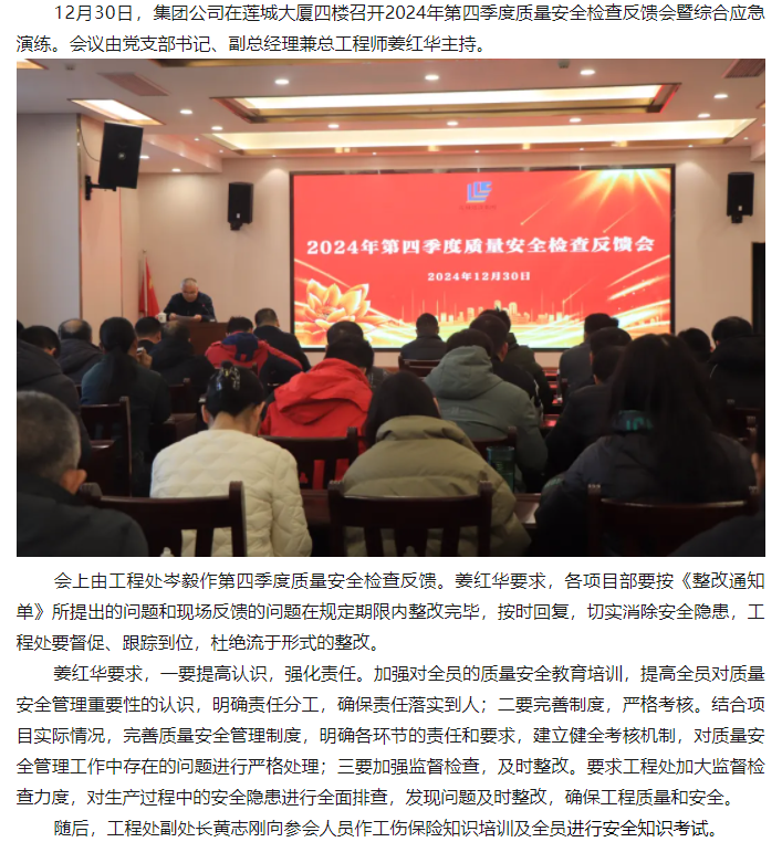 12月30日,集團公司在蓮城大廈四樓召開2024年第四季度質(zhì)量安全檢查反饋會暨綜合應急演練。...