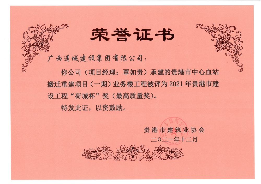 2021年貴港市建設(shè)工程“荷城杯”獎(最高質(zhì)量獎)貴港市中心血站搬遷重建項目(一期)業(yè)務樓工程,項目經(jīng)理:覃如貴