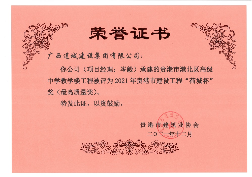 2021年貴港市建設(shè)工程“荷城杯”獎(最高質(zhì)量獎)貴港市港北區(qū)高級中學教學樓工程,項目經(jīng)理:岑毅