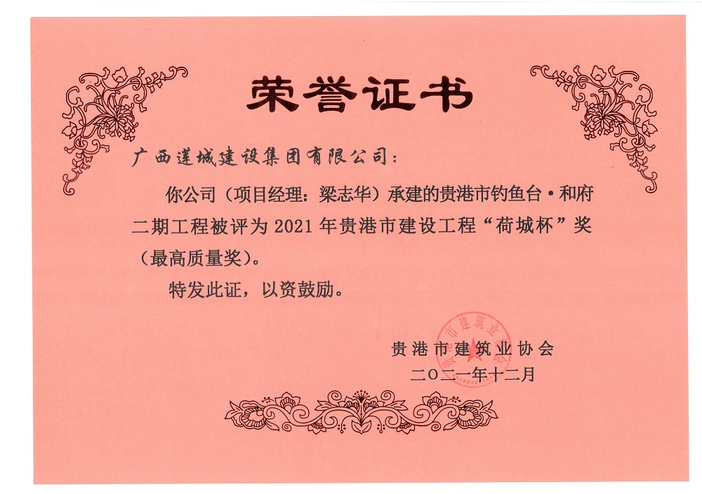 2021年貴港市建設(shè)工程“荷城杯”獎(最高質(zhì)量獎)貴港市釣魚臺-和府二期工程,項目經(jīng)理:梁志華