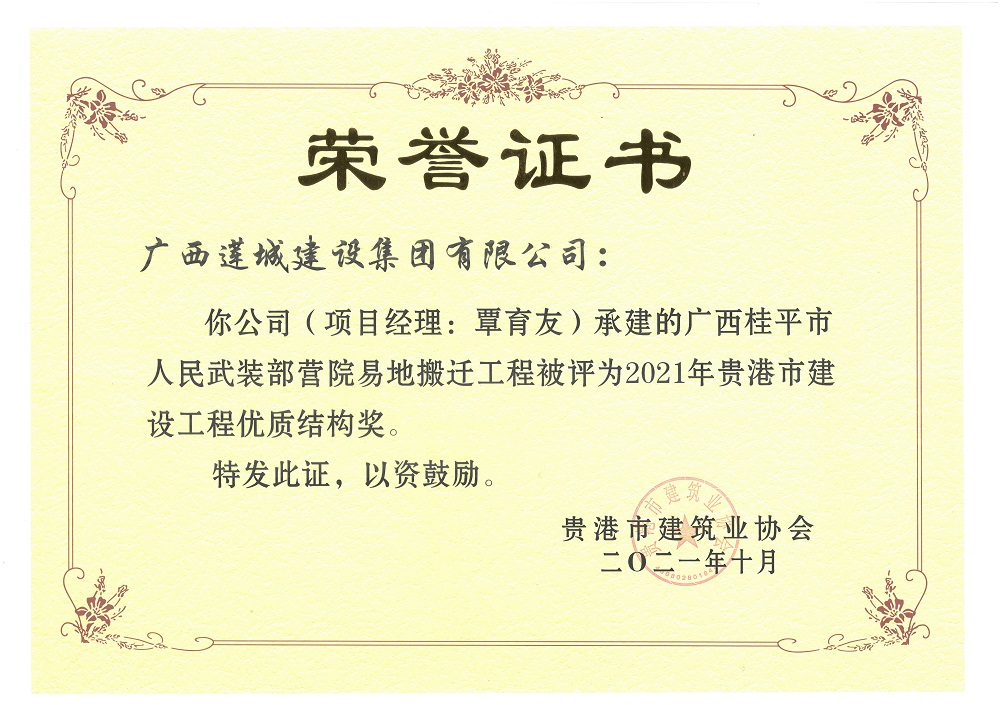 2021年貴港市建設(shè)工程優(yōu)質(zhì)結(jié)構(gòu)獎廣西桂平市人民武裝部營院易地搬遷工程,項目經(jīng)理:覃育友