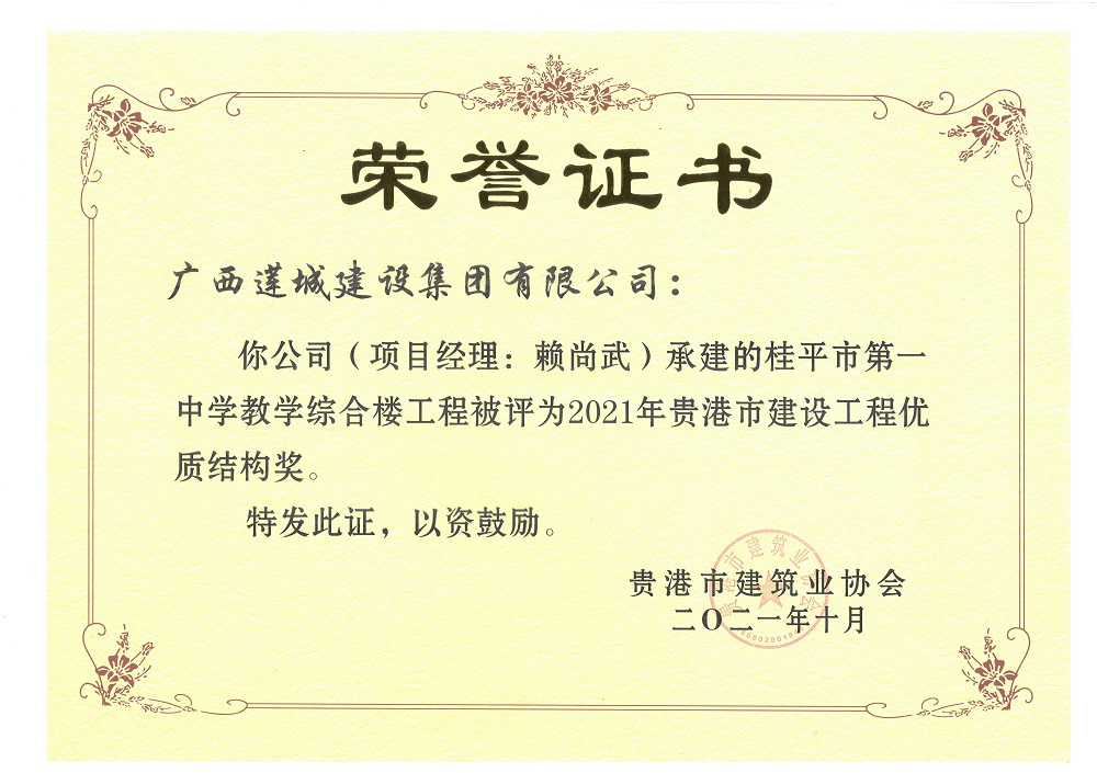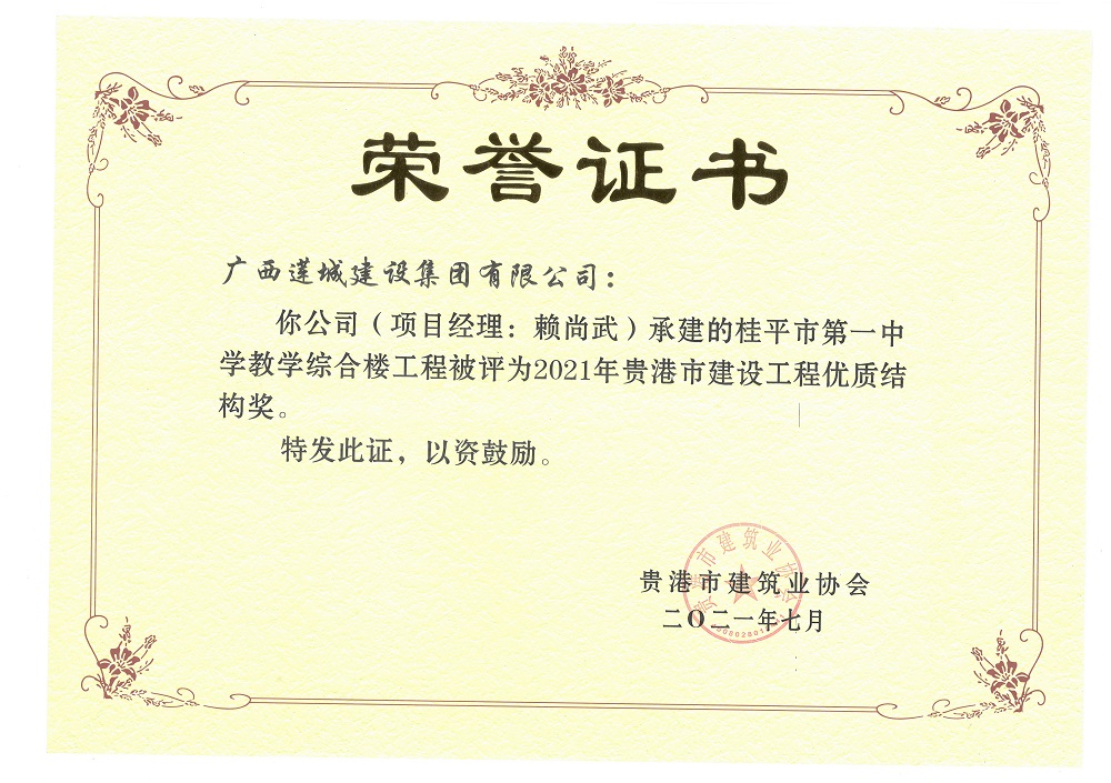2021年貴港市建設(shè)工程優(yōu)質(zhì)結(jié)構(gòu)獎桂平市第一中學教學綜合樓工程,項目經(jīng)理:賴尚武