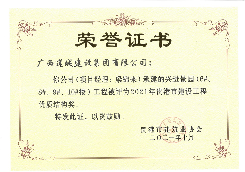 2021年貴港市建設(shè)工程優(yōu)質(zhì)結(jié)構(gòu)獎興進景園(6#、8#、9#、10#樓)工程,項目經(jīng)理:梁錦來