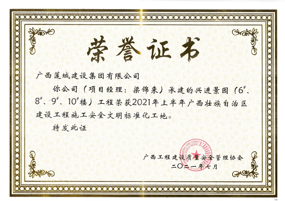 2021年上半年貴港市建設(shè)工程施工安全文明標準化工地獎興進景園(6#、8#、9#、10#樓)工程,項目經(jīng)理:梁錦來