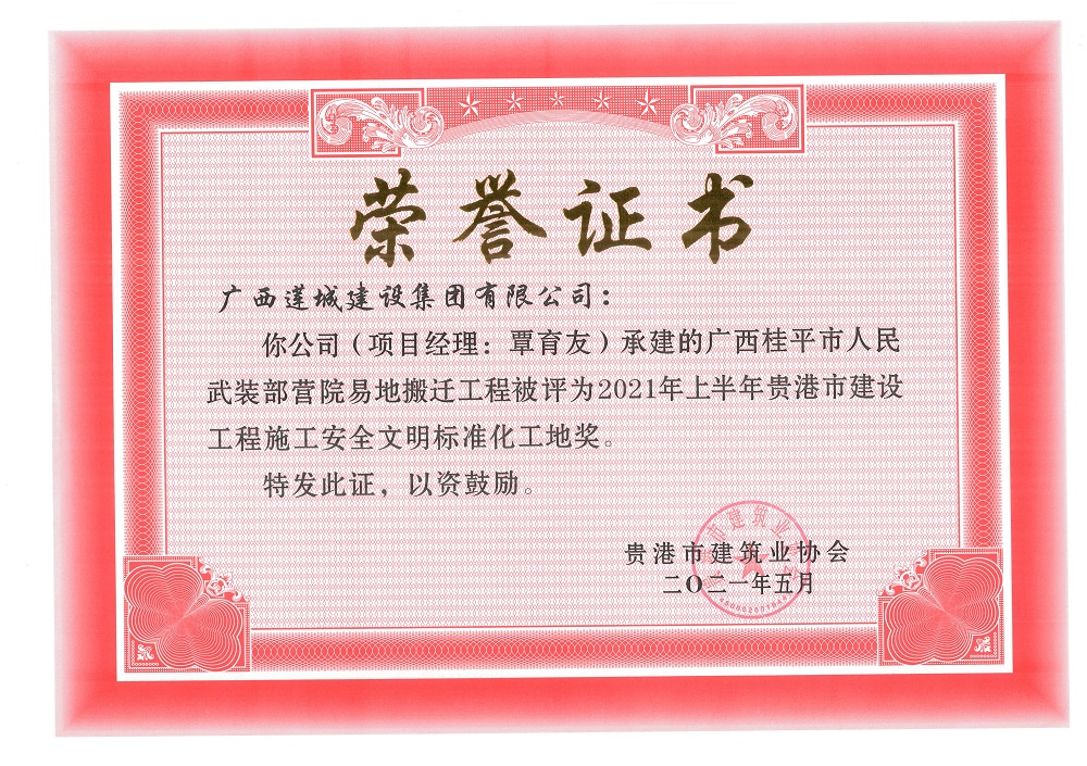 2021年上半年貴港市建設(shè)工程施工安全文明標準化工地獎廣西桂平市人民武裝部營院易地搬遷工程,項目經(jīng)理:覃育友