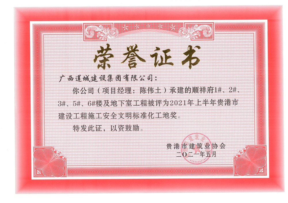 2021年上半年貴港市建設(shè)工程施工安全文明標準化工地獎順祥府1#、2#、3#、5#、6#樓及地下室工程,項目經(jīng)理:陳偉土