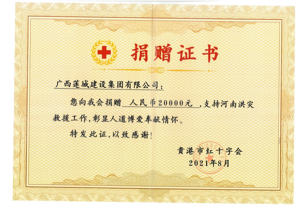 2021年公司向貴港市紅十字會河南洪災捐款,公司捐款20000元