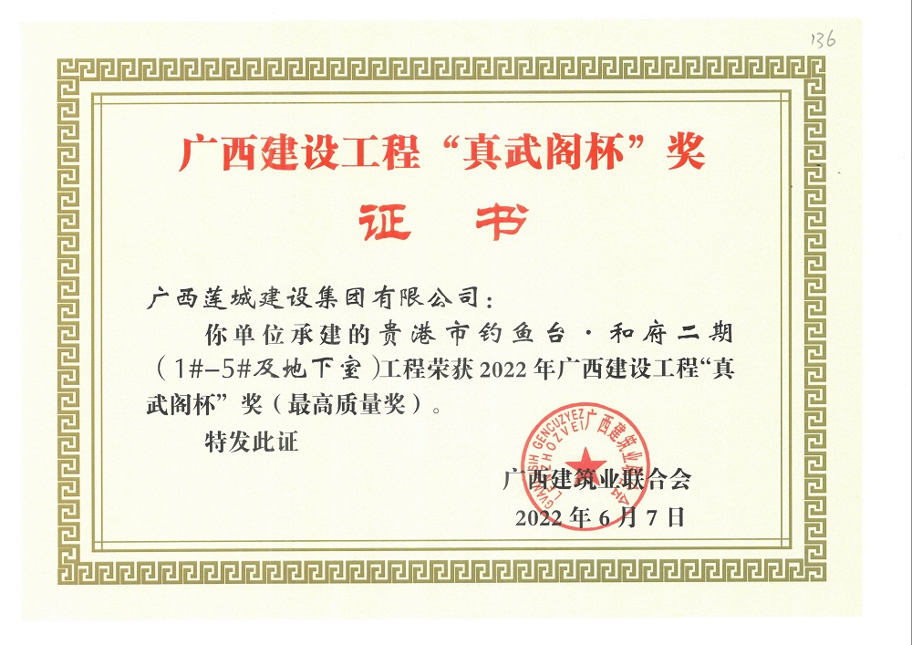 2022年廣西建設(shè)工程“真武閣杯”獎(jiǎng)(最高質(zhì)量獎(jiǎng))貴港市釣魚臺(tái)和府二期(1#-5#及地下室),項(xiàng)目經(jīng)理:梁志華