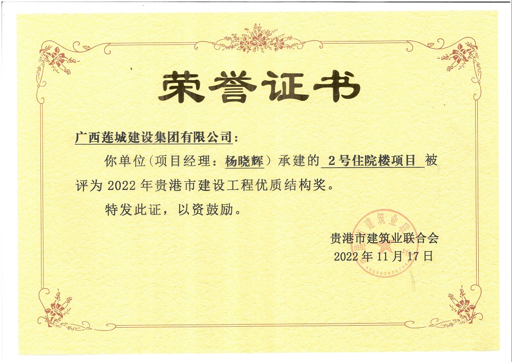 2022年貴港市建設(shè)工程優(yōu)質(zhì)結(jié)構(gòu)獎(jiǎng)2號(hào)住院樓項(xiàng)目,項(xiàng)目經(jīng)理:楊曉輝