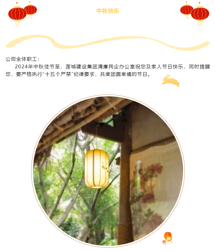 全體蓮城人:一元復(fù)始,萬(wàn)象更新!值此新春佳節(jié)來(lái)臨之際,蓮城建設(shè)集團(tuán)清廉民企辦公室向您及您的家人致以親切地問(wèn)候!春節(jié)既是歡樂(lè)喜慶的日子,同時(shí)也是違紀(jì)越規(guī)的高危期,在此,蓮城建設(shè)集團(tuán)清廉民企辦公室特發(fā)出這封節(jié)前廉潔過(guò)節(jié)提醒函,希望全體蓮城人戒奢以儉、廉潔過(guò)節(jié)、文明過(guò)節(jié)!年關(guān)是人情關(guān),也是廉潔關(guān)。希望大家...